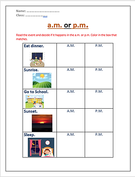 Low-level worksheet: students have to color the correct answer, look at the picture and read the event then color if it is AM or PM.